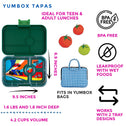 Ideal for adults, active teens & pre-teens, Yumbox Tapas features a 5-compartment removable tray designed to simplify packing favorite foods. Its leakproof design, with molded silicone lined lid, allows worry-free packing of dips and crackers. The 4.2 cups total volume (plus dip/treat well) ensures healthy portions and minimizes waste.